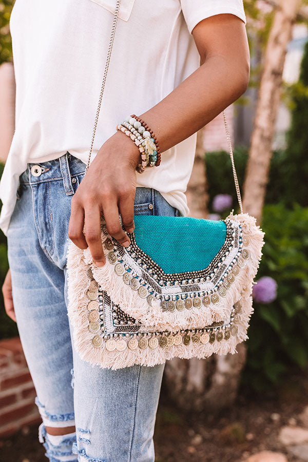 Accessorize your OOTD "all the way" with this eye-catching clutch featuring lightweight turquoise woven material with silver charm embellishing and fringed tassel trim, a flap closure, and a spacious rectangular pouch with a chain shoulder strap!