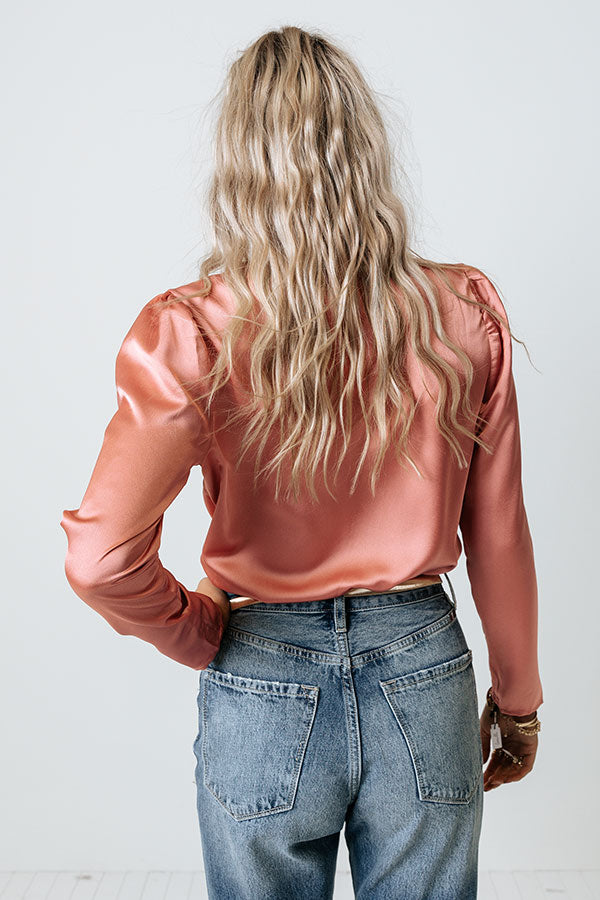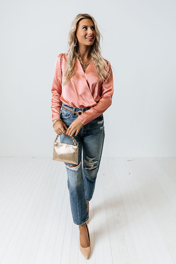 You are guaranteed to turn heads when you arrive in this appealing blush colored bodysuit featuring sleek satin material, a faux wrap bodice with a v-cut neckline, long loose sleeves, and a flattering silhouette that ends in cheeky fit bottoms with a snap button closure! Measurements