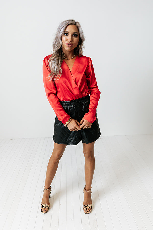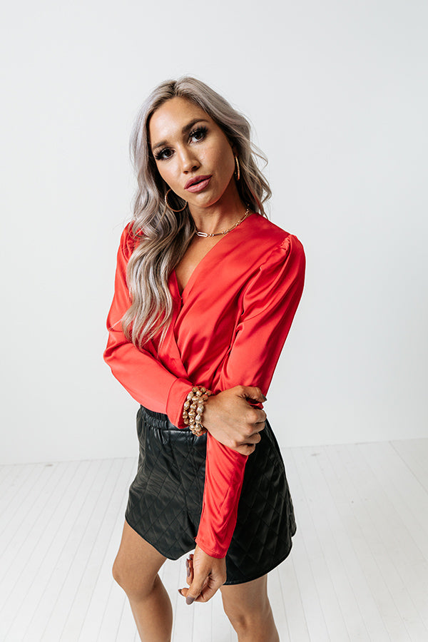 You are guaranteed to turn heads when you arrive in this appealing red bodysuit featuring sleek satin material, a faux wrap bodice with a v-cut neckline, long loose sleeves, and a flattering silhouette that ends in cheeky fit bottoms with a snap button closure!