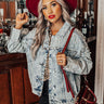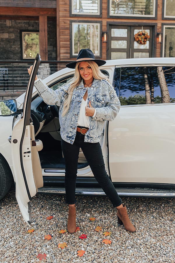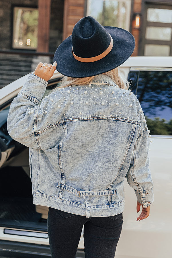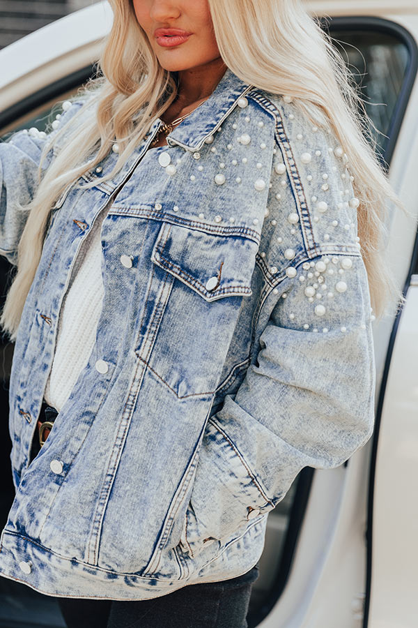 People are sure to be envious of your personal style when you layer up with this appealing denim jacket featuring light acid wash denim material with pearl and rhinestone detailing, a button down front with a collared neckline, long loose sleeves with button closure cuffs, two accent chest pockets with flap closures, and a relaxed silhouette that falls into a straight hemline! Measurements