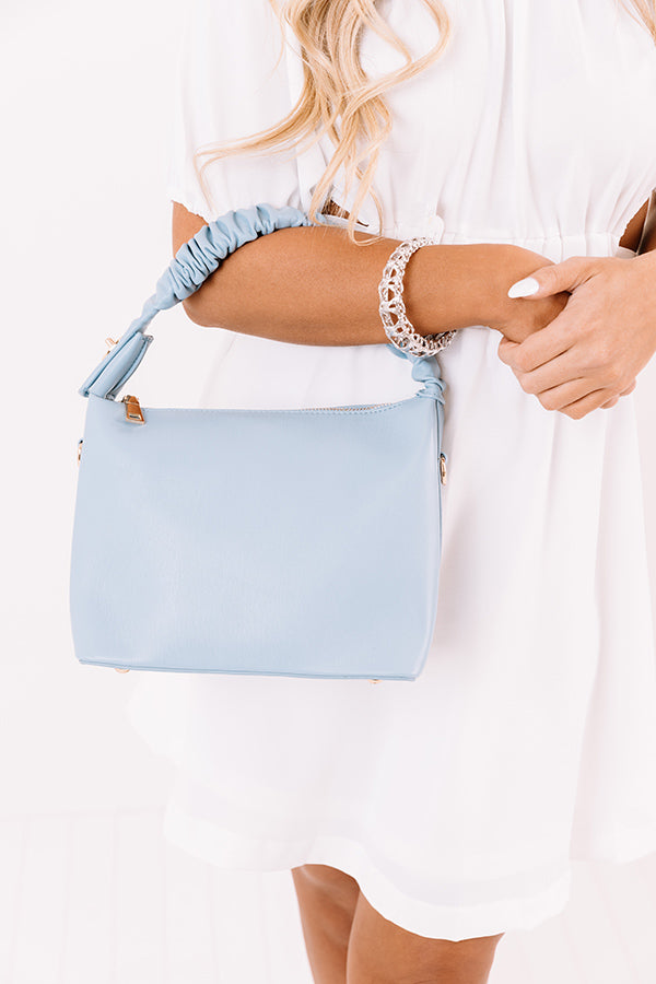 We have no doubt this trendy airy blue tote will be an all time favorite of yours with its sleek faux leather material, a single tote handle with ruched detailing and gold hardware, a removable and adjustable shoulder strap, and a spacious fully lined rectangular pouch with a zip closure and additional inside pockets!