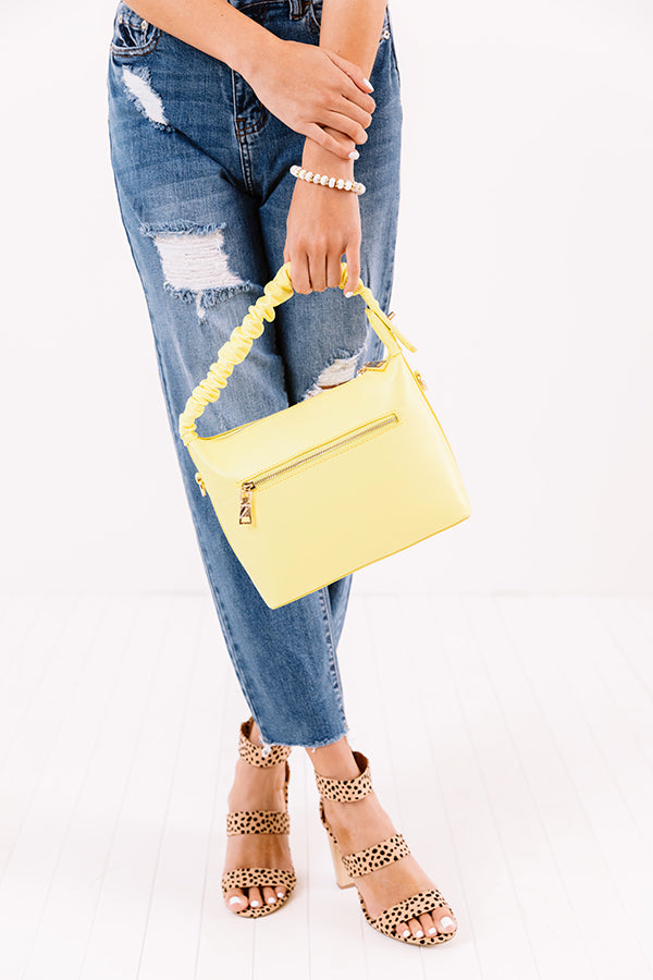 We have no doubt this trendy yellow tote will be an all time favorite of yours with its sleek faux leather material, a single tote handle with ruched detailing and gold hardware, a removable and adjustable shoulder strap, and a spacious fully lined rectangular pouch with a zip closure and additional inside pockets!