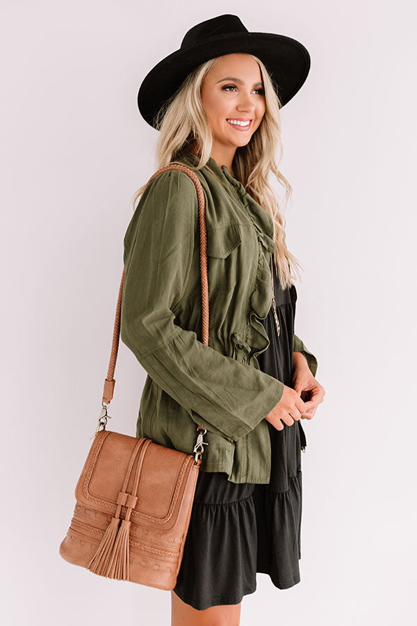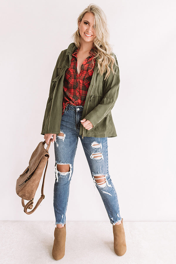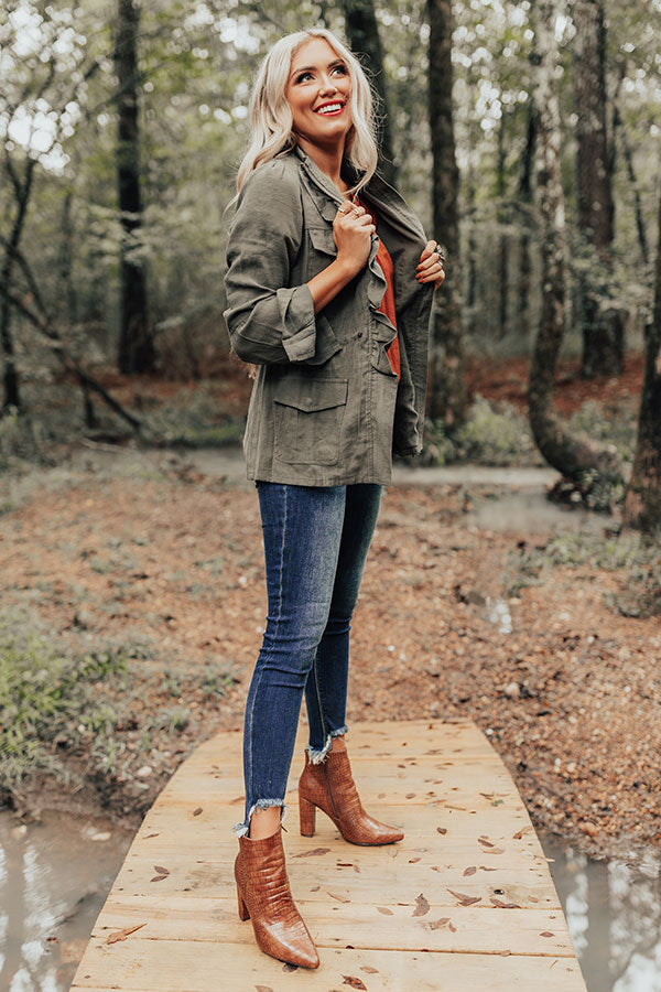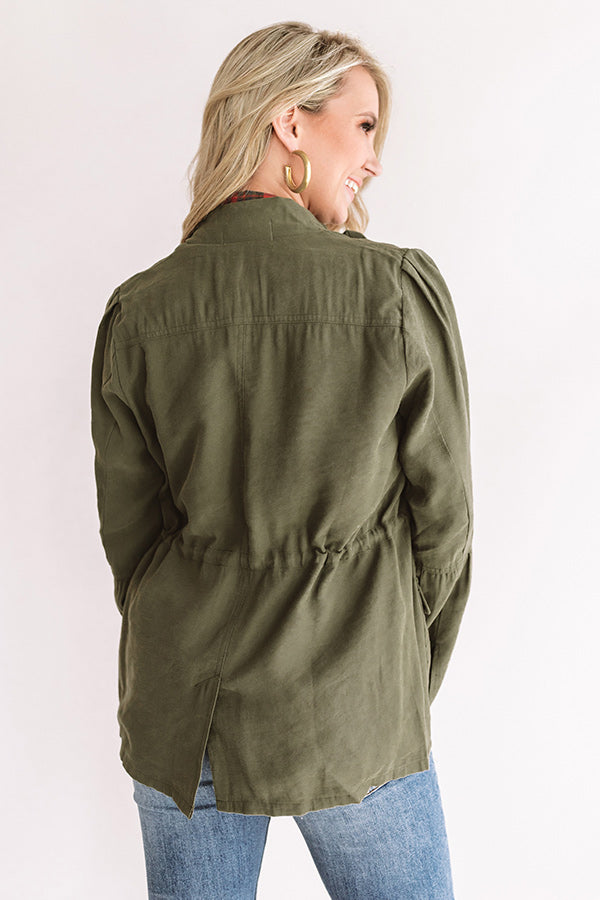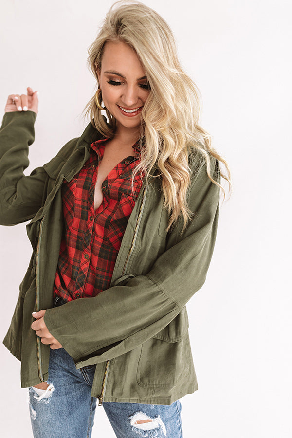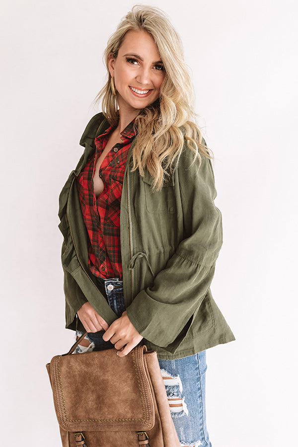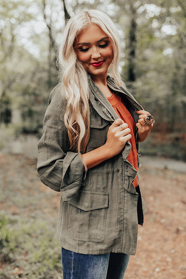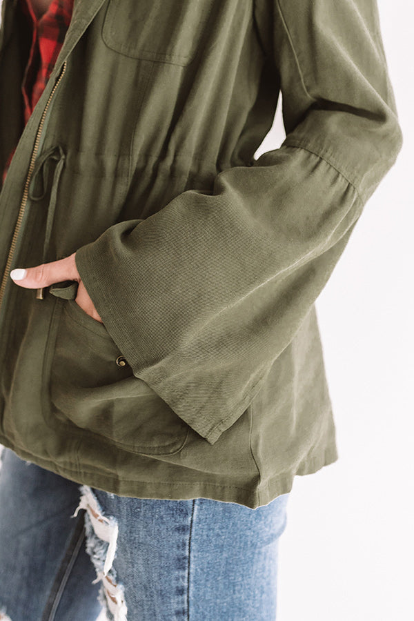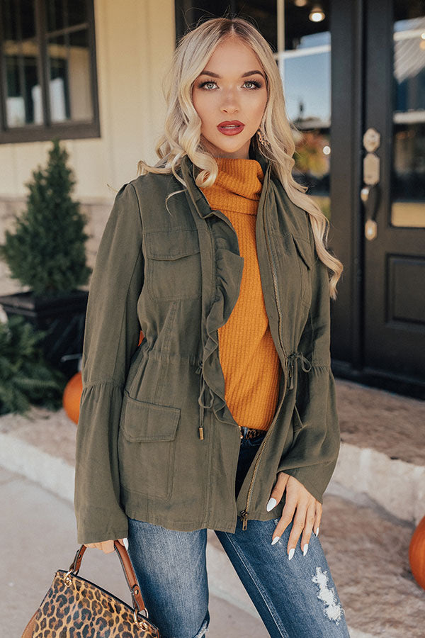 The green hued "All Who Wander" jacket is sure to keep you warm during those chilly fall days with its lightweight fit, long sleeves with slit cuffs that flare at the elbow, four flap accent pockets with snap closure, cinched waistband with a tie belt, straight hemline with a back center notch, and ruffled zip up front silhouette! Measurements