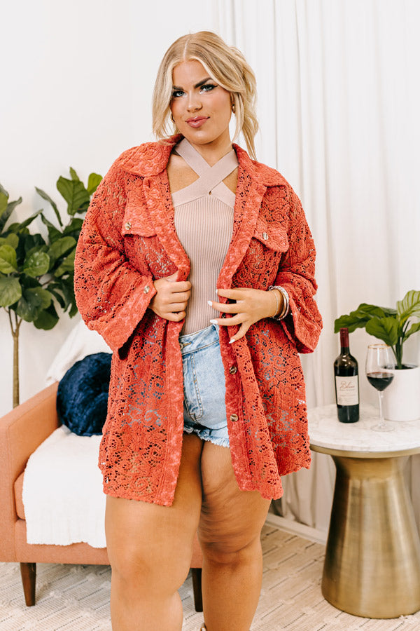 Be boho beautiful in this trendy layering top! Features beautiful rust colored floral lace, collared neckline that goes into a button down front, faux chest pocket buttoned flap accents, long cuffed sleeves with button closure, and a relaxed silhouette that ends in a slightly rounded hemline.
