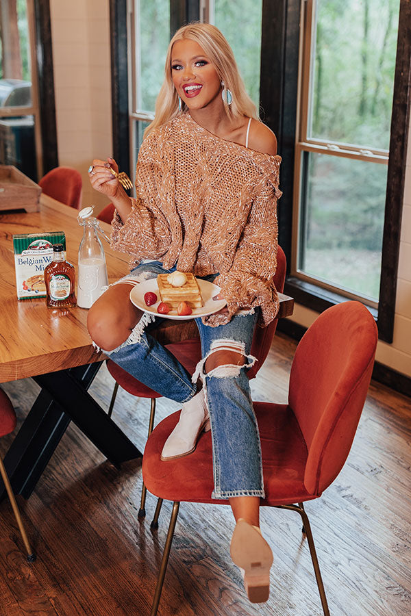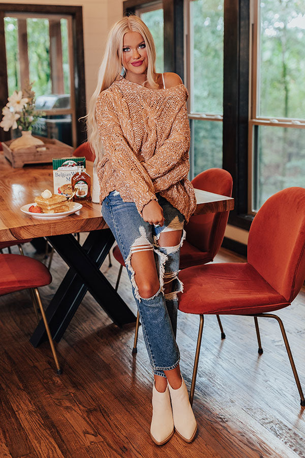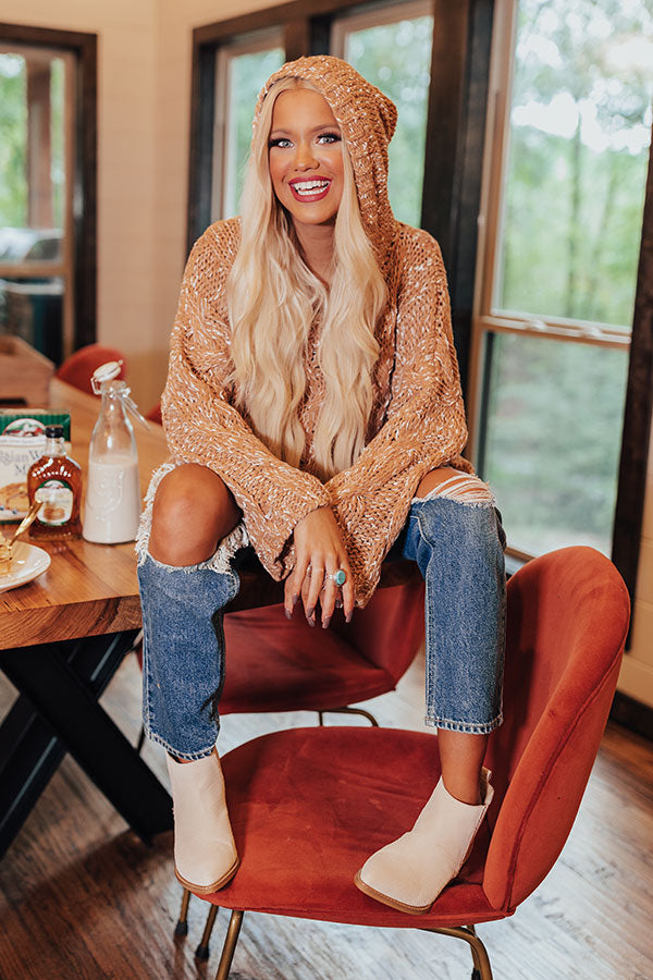 Stay warm throughout those colder months with our adorable camel colored "Along The Pines" sweater featuring ultra soft and thick cable knit material, a high neckline with a hooded back that can be worn off one shoulder, long oversized sleeves, and a relaxed silhouette that falls into an uneven hemline! Measurements