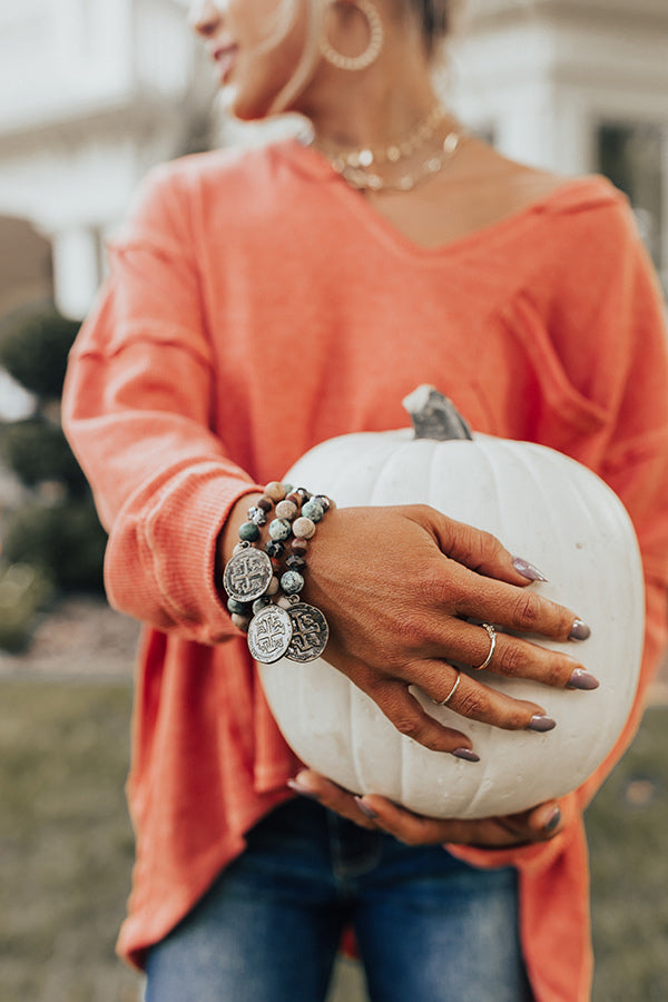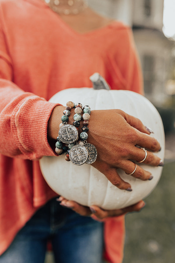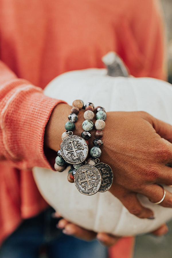 Our 'Alpine Promise' bracelet features a bronze coin style pendant, a single stretchy strand of natural, green, and rust hued semi precious stones which are accented by several bronze and smoky colored crystal beads.