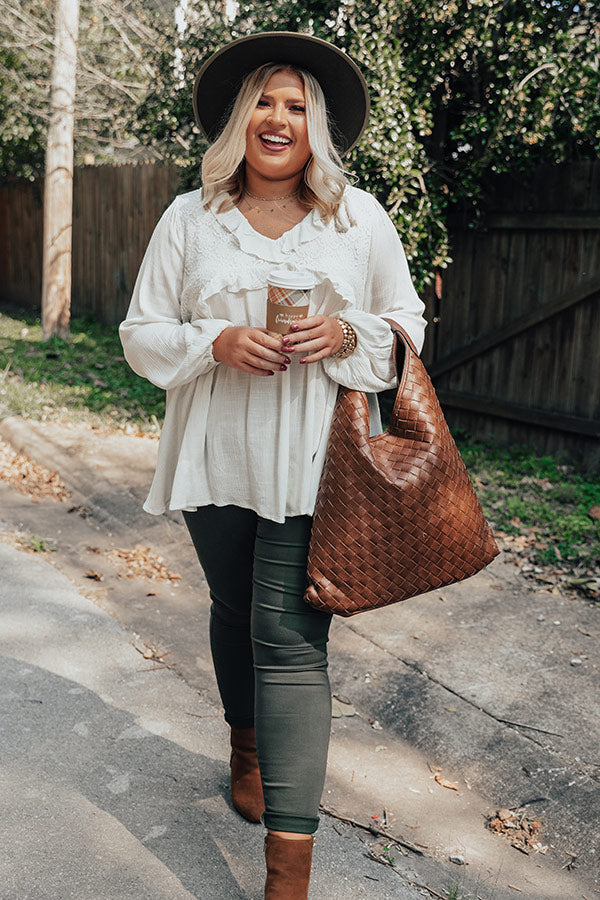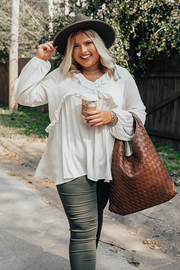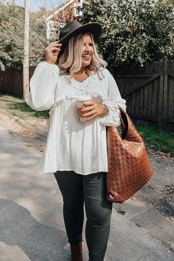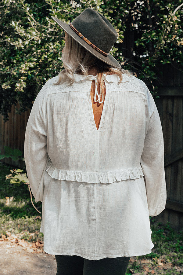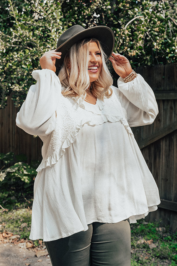 Plus Size - We have no doubt people will be enamored with this charming ivory colored top featuring lightweight flowy linen like material with ruffled accents, a v-cut neckline with intricate crochet detailing across the bodice, long bubble sleeves with elastic cuffs, a deep v-cut neckline back with a tie closure, and a relaxed silhouette that falls into an uneven hemline! Measurements