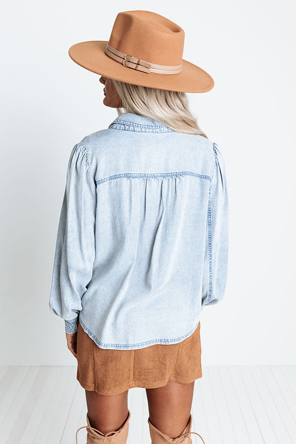 Add a casual finish to your look with our cute 'Always Down To Chill' top featuring lightweight light wash chambray material with accent fading, long loose sleeves with button closure cuffs, a button down front with a collared neckline, two accent chest pockets with flap closures, and a relaxed silhouette that falls into a rounded hemline!