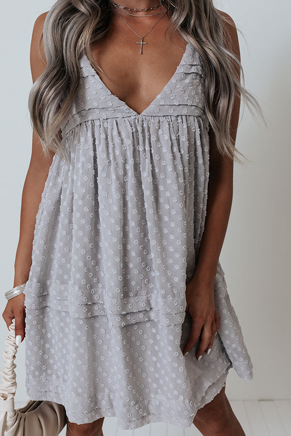 Dream big in this darling heirloom lilac hued dress featuring lightweight breezy material with knit polka dot texturing, a v-cut neckline and upper back with adjustable spaghetti straps, and a relaxed babydoll silhouette that falls into a straight mid-thigh length hemline! Measurements