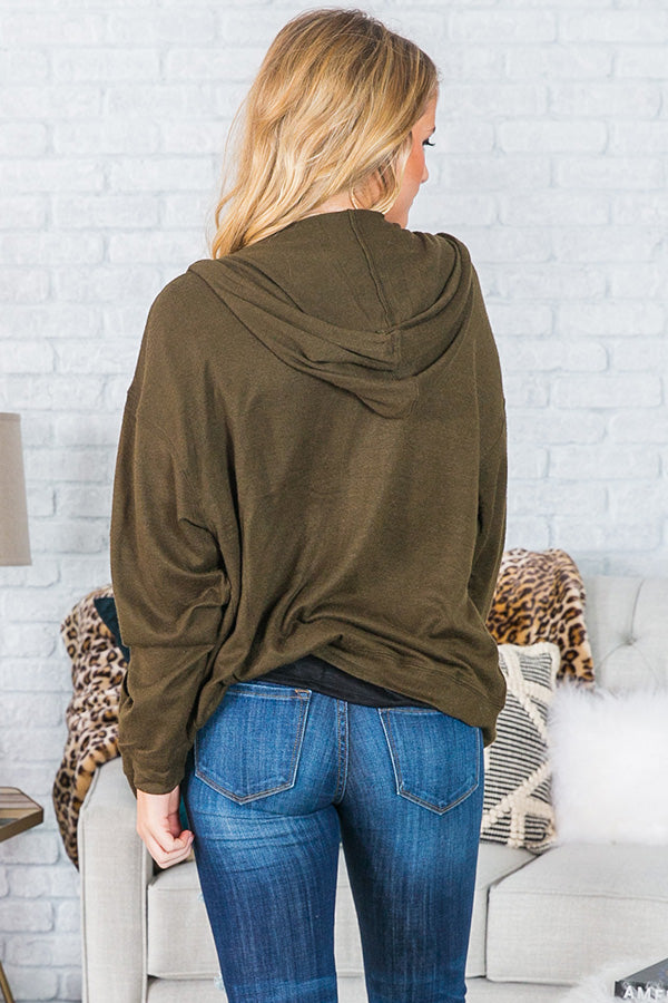 This army green sweater is for all you ladies who are "always on cabin time" with its zip up front, hooded collar, pockets, long sleeves, and lightweight material! To stay warm, you can style this piece over a basic black tee with some distressed skinnies and camouflage sneakers, or you can layer a sporty camisole under it with our "Prosecco And Push Ups Midrise Legging," our "The Karlie Perforated Bootie in Grey," and "Cold Snap Metallic Beanie in Grey!" Measurements