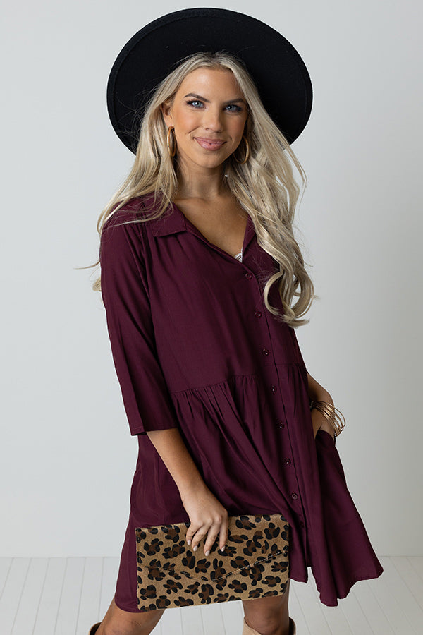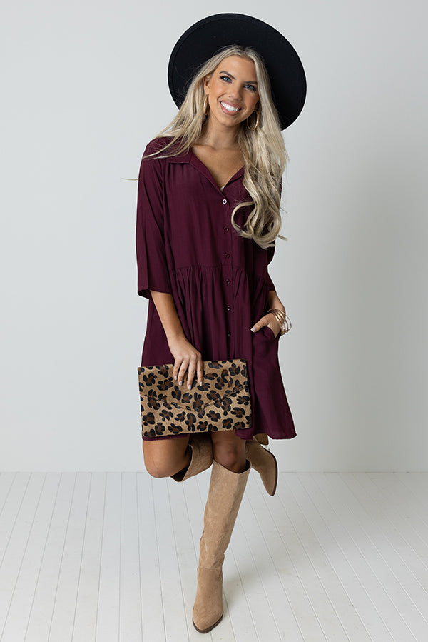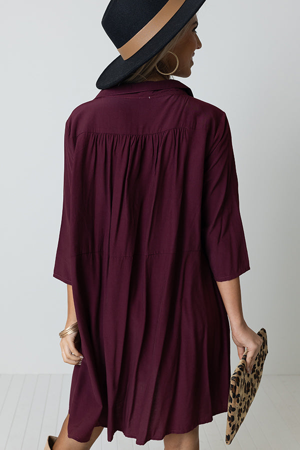 Effortlessly transition into the colder months with our darling maroon colored 'Always On Time' tunic dress featuring lightweight flowy material, a button down front with a collared neckline, loose 3/4-length sleeves, low side pockets and a relaxed babydoll silhouette that falls into a straight mid-thigh length hemline! Measurements