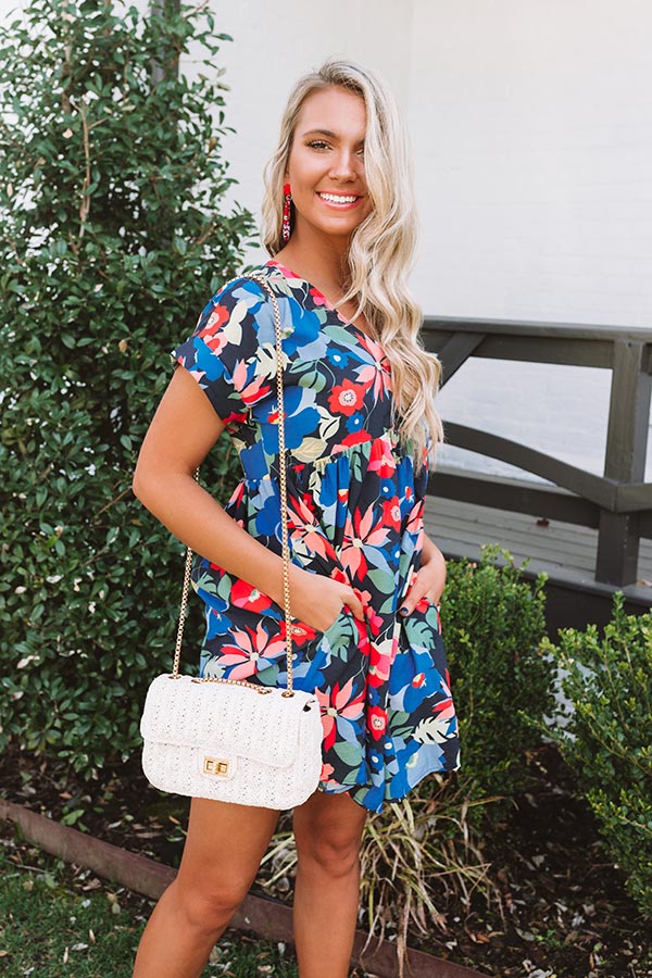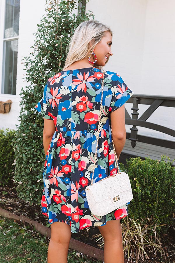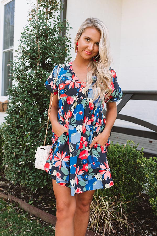 There is no better piece to wear when you are "Amalfi bound" than this adorable navy dress featuring lightweight material patterned with a bold blue, red, and green hued floral print, a v-cut neckline, short loose sleeves, hidden side pockets, and a relaxed babydoll silhouette that falls into a straight mid-thigh length hemline! You can style this cutie a variety of ways, like with a white wedge and crossbody, but you can also wear it with our "So Relatable Heel in Red" and our "Mimosa Party Cat Eye Sunnies in Red!" Measurements