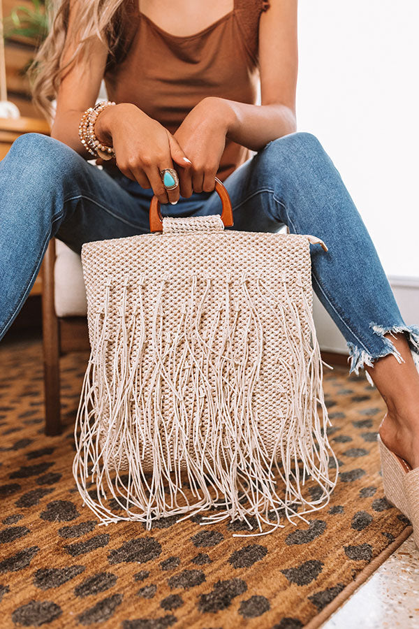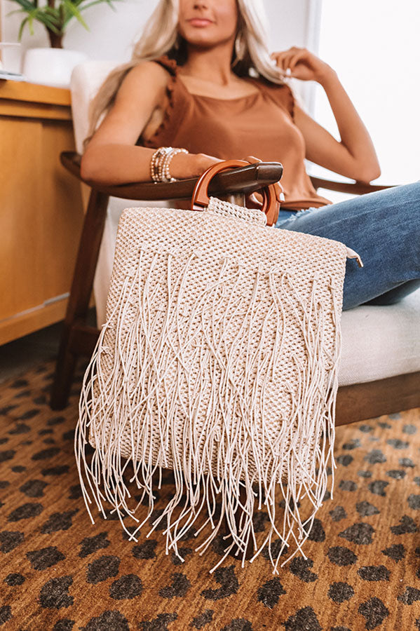 There is no better bag to wear when you are bound for the Amalfi coast than this adorable ivory colored tote featuring woven material, two rounded wooden handles, ultra long fringe accents, and a spacious square pouch with with a zip closure and an additional inside pocket!