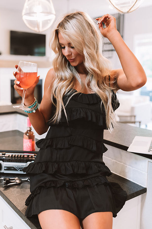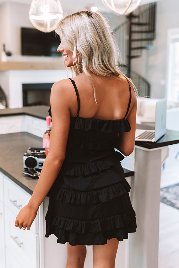 Whether you're going to happy hour or on a date, our little black "Amalfi Spritz" dress is perfect for you! It features lightweight material with oversized tiered ruffle seams, a scooped neckline, adjustable spaghetti straps with a zip closure back, and a form fitting silhouette that falls into an uneven mid-thigh length hemline! We have styled this flirty piece with some turquoise jewelry and leopard heels, but you can also wear it with "The Carolina Heel in Gold," our gold "Spread Your Wings Butterfly Hair Clip Set," and our "Cute As Can Be Clutch in Gold!" Measurements