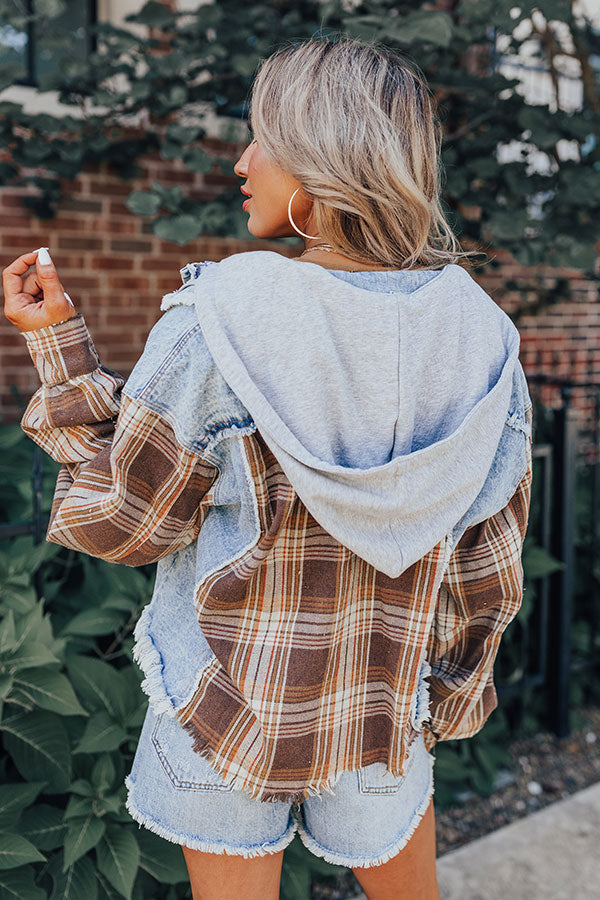 - Unlined non-stretch denim material with distressed detail as well as patches of brown, orange, and ivory hued plaid materials