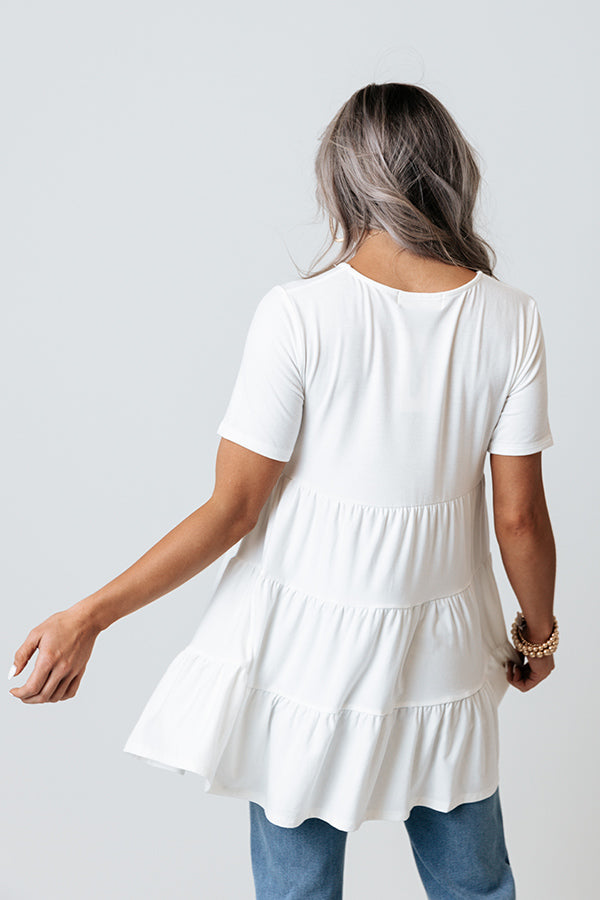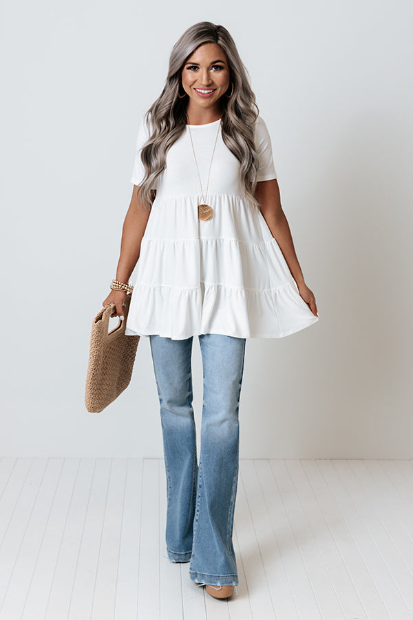 Dream big in this darling white top featuring soft and lightweight flowy material, a high rounded neckline, short sleeves, and an ultra relaxed tiered babydoll silhouette that cascades into an uneven tunic-length hemline! Measurements