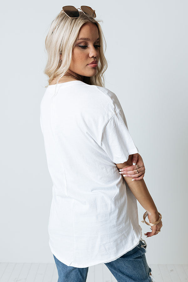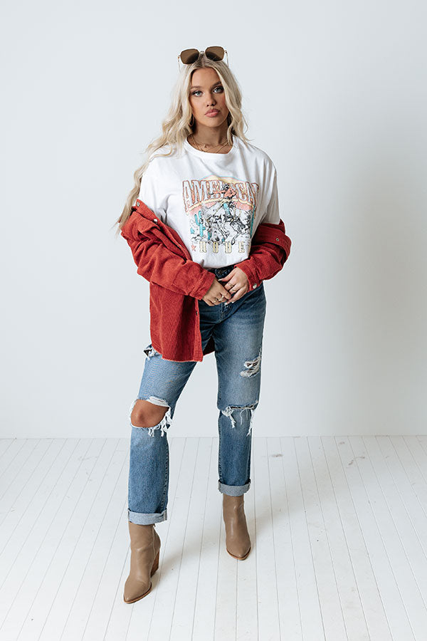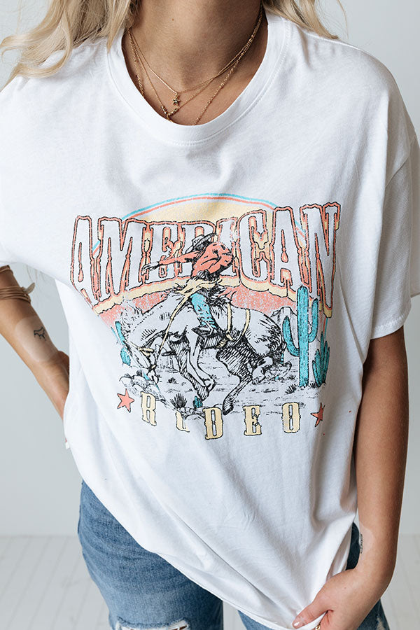 Channel the wild west in your look with our darling white 'American Rodeo' tree featuring soft and lightweight cotton-blend material with a cute colorful horse graphic on the front, a rounded neckline, short loose sleeves, and a relaxed silhouette that ends in a straight hemline! Measurements