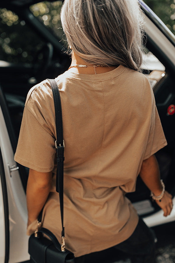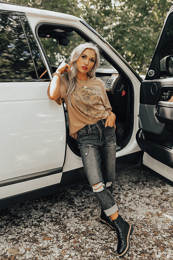 Show off your patriotic side in the most stylish of ways with our adorable khaki hued 'American Spirit' tee featuring soft lightweight material with a cute black eagle graphic on the front, a rounded neckline, short sleeves, and a relaxed silhouette that ends in a straight hemline! Measurements