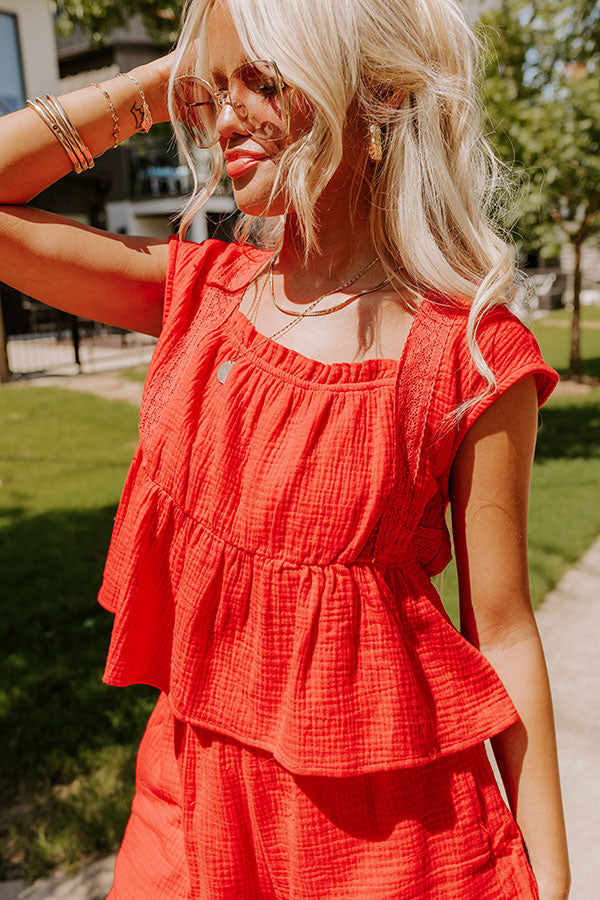 - A square cut neckline with a ruffle detail, back button closure, and a keyhole detail