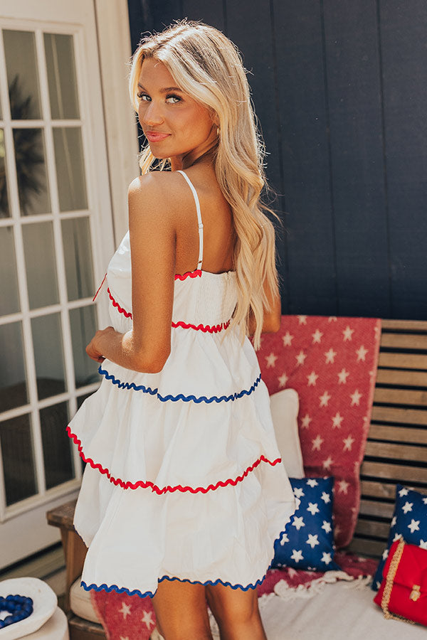 - A flowy tiered silhouette that ends in a mini dress length hemline