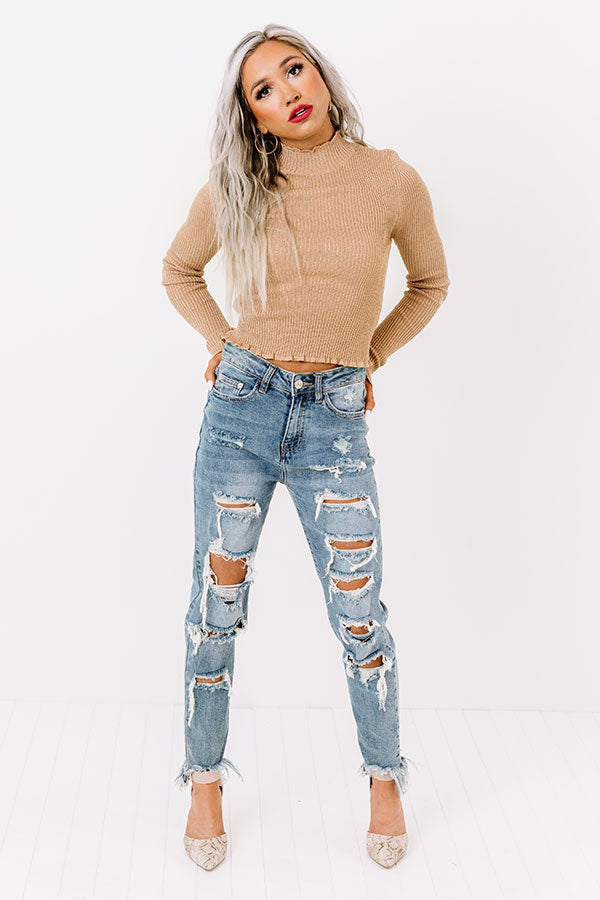 Our darling iced latte colored 'Amuse You Top' is sure to put a smile on your face with its soft lightweight tight knit material, subtle ribbed texturing, turtle neckline, long loose sleeves, and flattering silhouette that ends in a straight hemline!