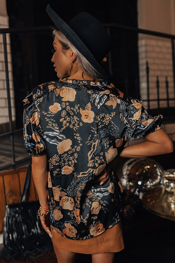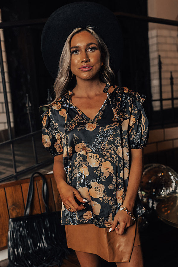 Arrive in style in our beautiful black 'Another Adventure Shift Top' featuring lightweight material patterned with a mustard and camel hued floral print, a tie closure v-cut neckline, loose short sleeves, and a relaxed silhouette that falls into a straight hemline!