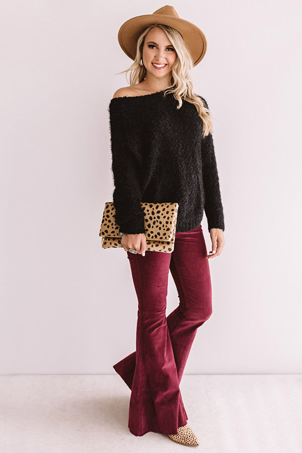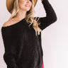 If you are 'anticipating autumn" then this black shift sweater is perfect for you with its stretchy tight knit material with eyelash fringe detailing, wide rounded neckline that can be worn off one shoulder, long loose sleeves, and an ultra relaxed bodice that falls into a rounded hemline! You can style this piece beautifully with some colored flares, a neutral faux suede hat, and a leopard bootie and clutch, or you can wear it with some distressed ankle skinnies, "The Saylie Peep Toe Heel in Black" and our "Endlessly Luxe Plaid Scarf!" Measurements