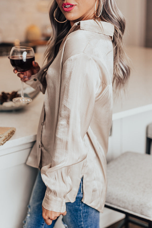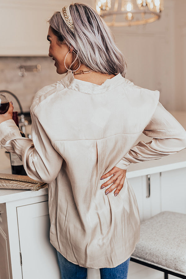 Anything is possible when you complete your look with this chic light birch hued top featuring sleek lightweight material, a button down front with a collared neckline, long loose sleeves with button closure cuffs, and a relaxed silhouette that falls into a rounded hemline! Measurements