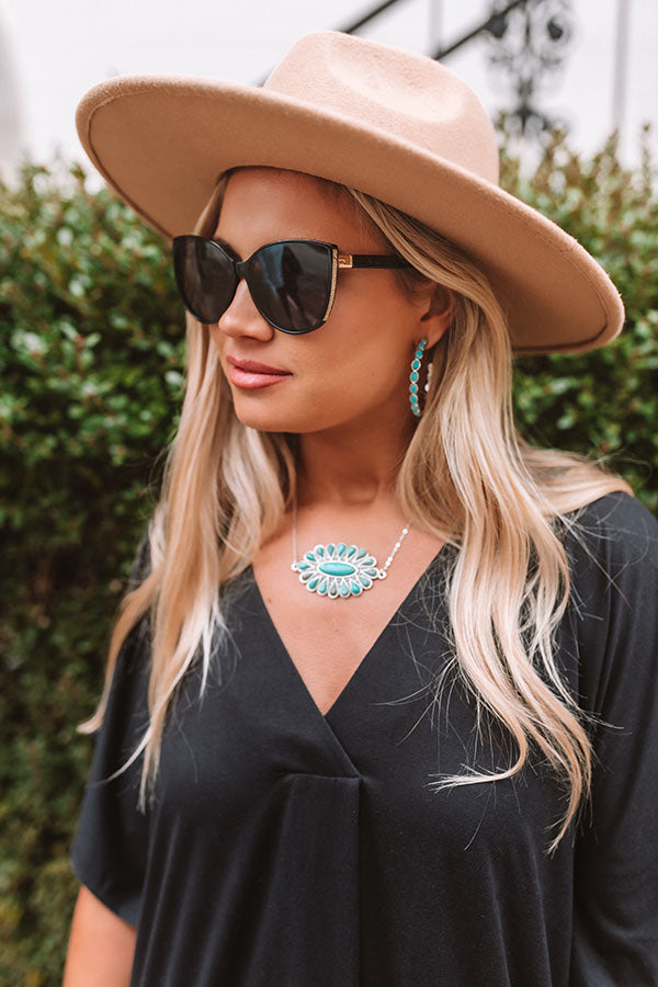 You can wear these adorable sunnies "anywhere on the map" and still look FABULOUS! They featuring large rounded black frames with gold accents and dark tinted lenses!