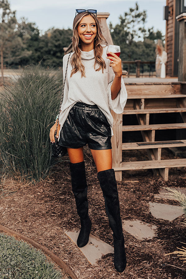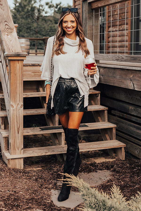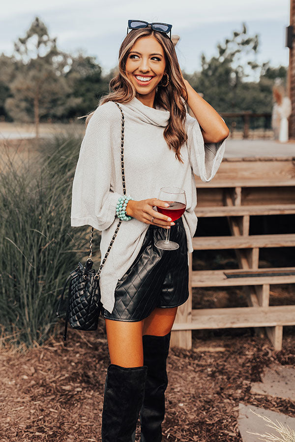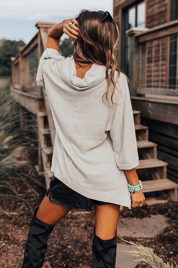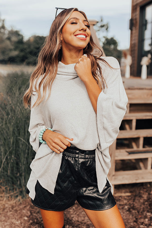 Complete your look effortlessly with our versatile grey 'Apple Trail Shift Top' featuring soft lightweight material, a draped turtleneck, oversized 3/4-length sleeves, and a slouched sihouette that falls into a straight hemline with accent side slits!