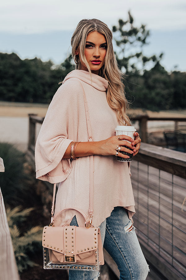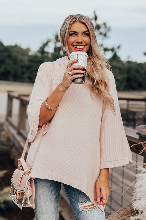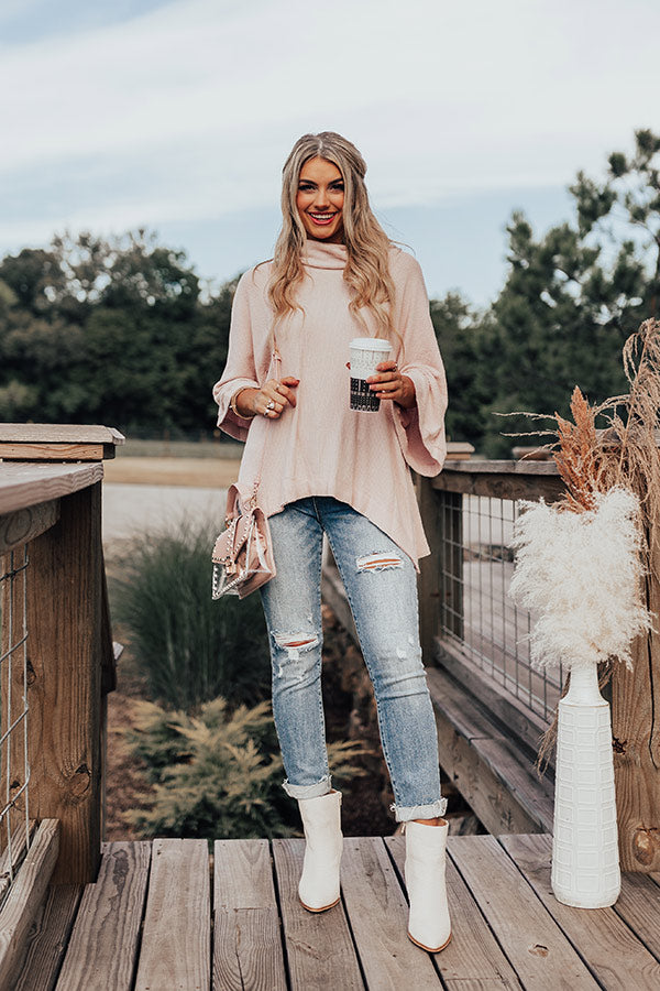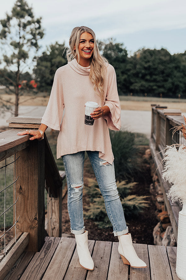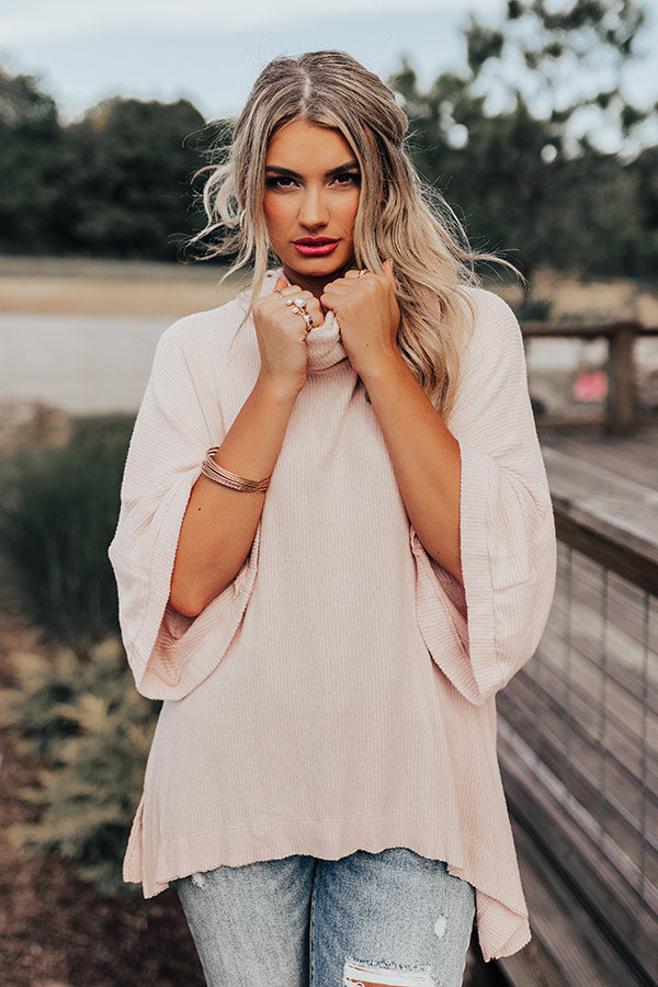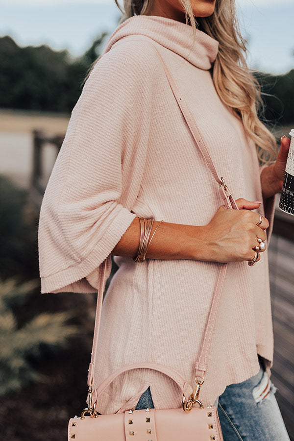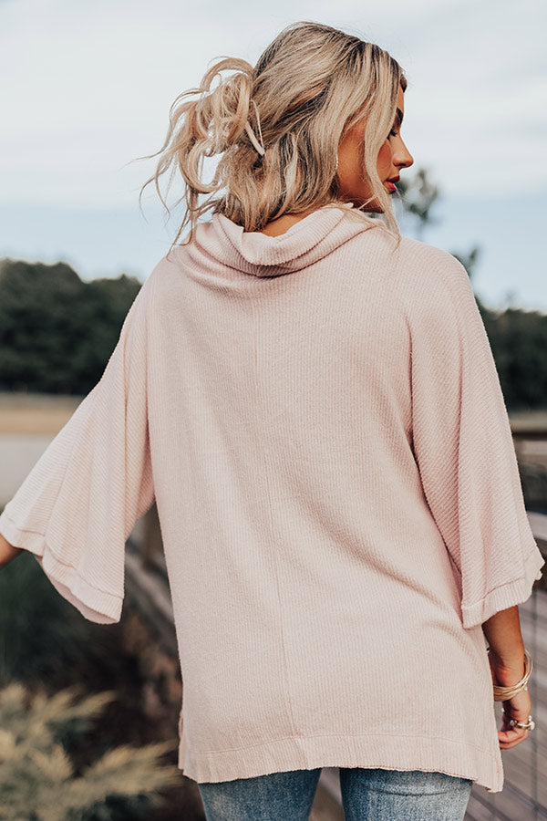 Complete your look effortlessly with our versatile pink 'Apple Trail Shift Top' featuring soft lightweight material, a draped turtleneck, oversized 3/4-length sleeves, and a slouched sihouette that falls into a straight hemline with accent side slits!