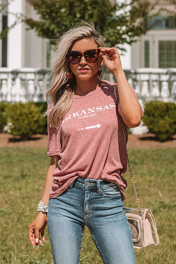 This light red lightweight tee is for all you ladies out there that will be Arkansas fans forever! It features a high neckline, short sleeves, and a loose bodice with a straight hemline that can be tucked in or knotted! Measurements