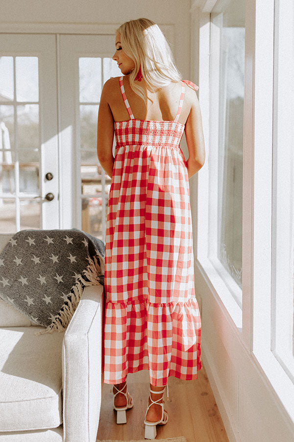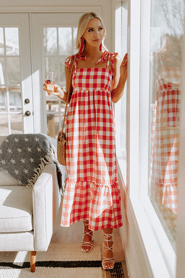 Perfect for any summer occasion, our charming 'Around The Boardwalk' dress features lightweight material patterned with a large scarlet and white gingham print, a straight neckline with tie closure shoulder straps, a cinched waistline, and a relaxed skirt silhouette that falls into a straight mid-calf length hemline! on products