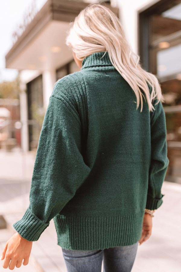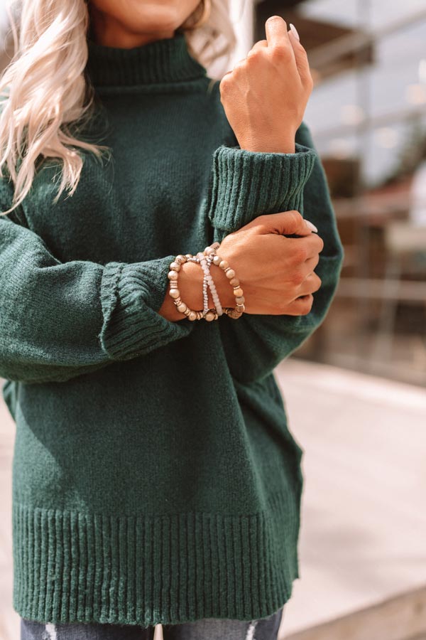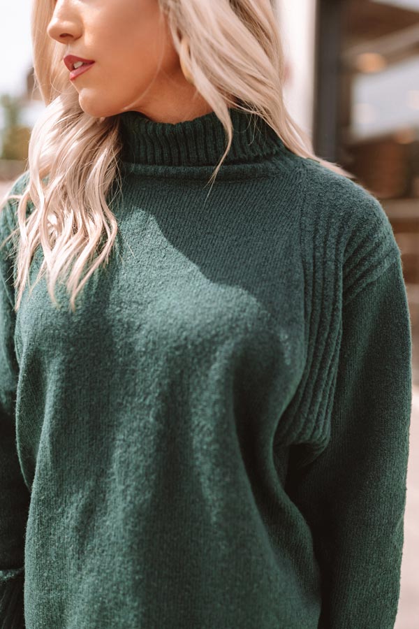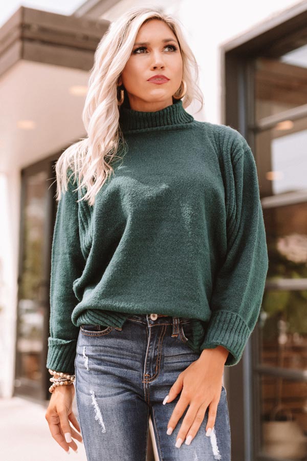 When hanging "around the bonfire" there is no better piece to be wearing than this hunter green shift sweater featuring ultra soft material, a high turtle neckline, long loose sleeves with fitted cuffs, and a straight fit bodice that falls into a straight ribbed hemline! You can style this cozy fall piece with some distressed ankle skinnies, dainty statement jewelry, and neutral booties, or you can pair it with a black skirt or black flares, "The Seraphina Faux Leather Wedge in Taupe," and our "Weekend In NYC Faux Leather Tote in Taupe!" Measurements