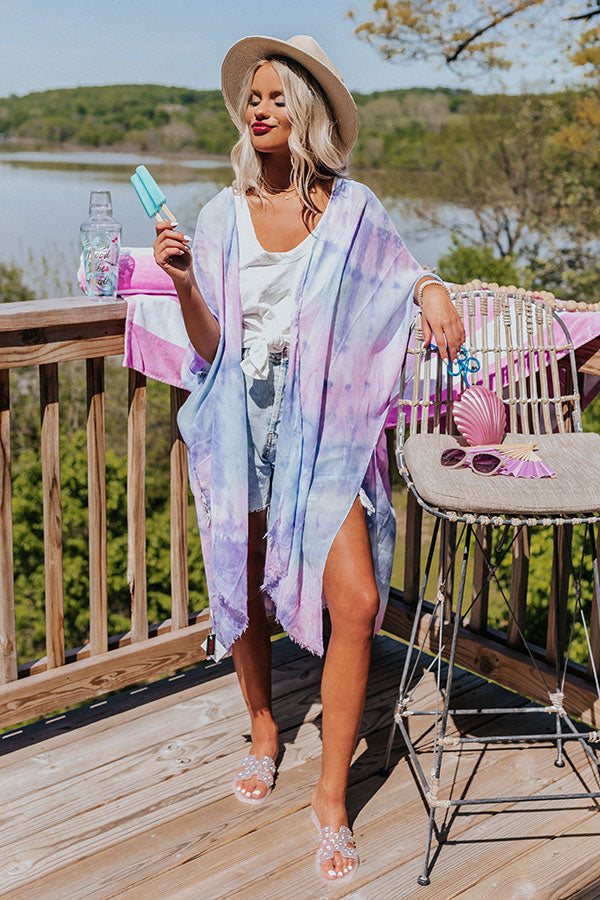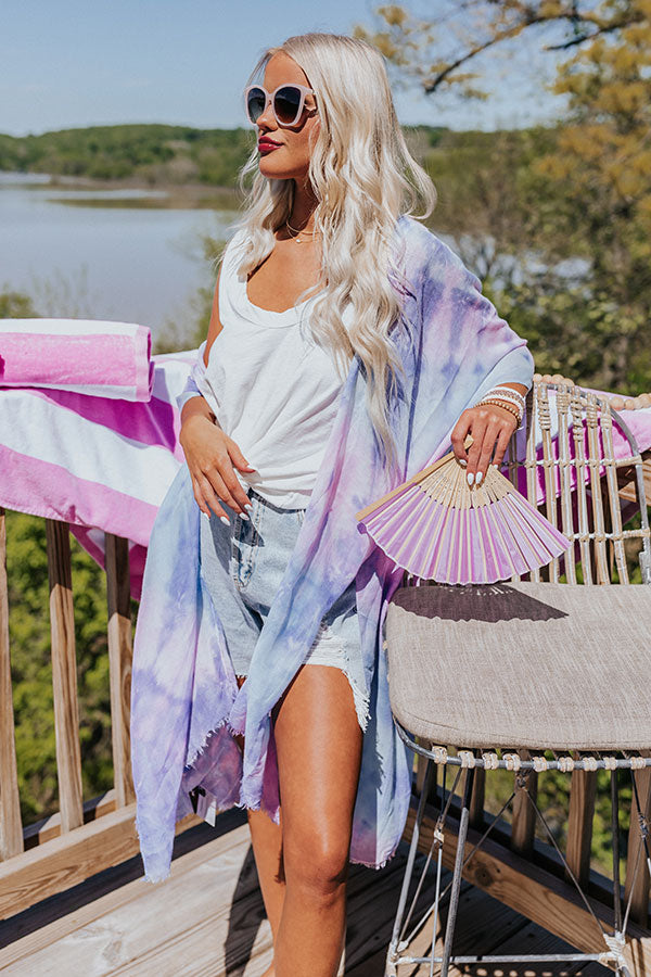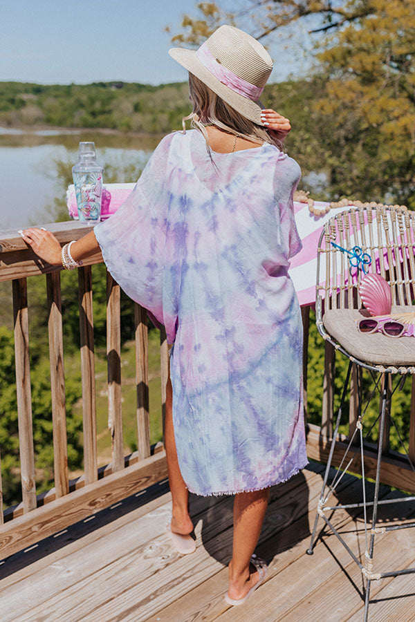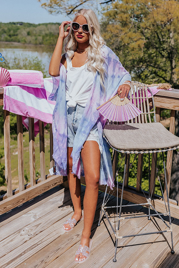 Lounge around the pool in style with this trendy overlay featuring lightweight breezy material patterned with purple, pink, and blue tie dye, oversized short sleeves, and an ultra draped open front silhouette that cascades into a straight mid-calf length hemline with accent side slits!