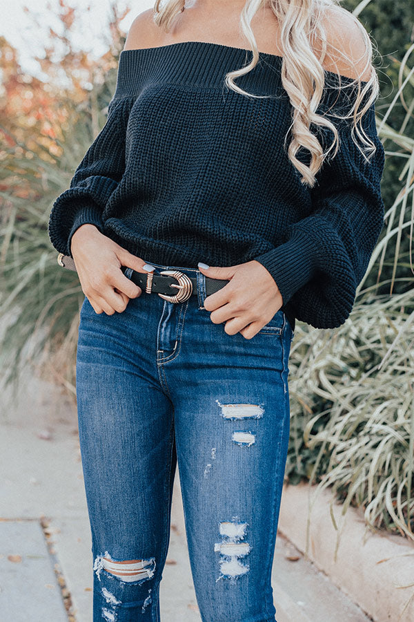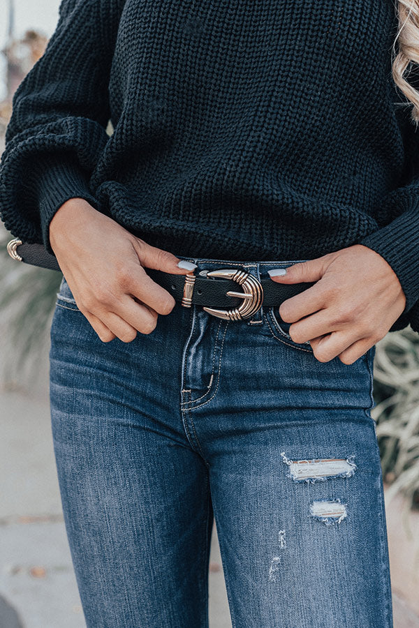 If you are wanting to add an artistic flare to your OOTD, then there is no better piece to accessorize with than this chic black belt featuring a faux leather band and textured gold hardware!