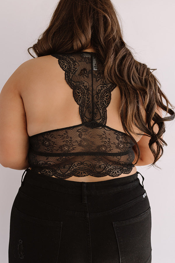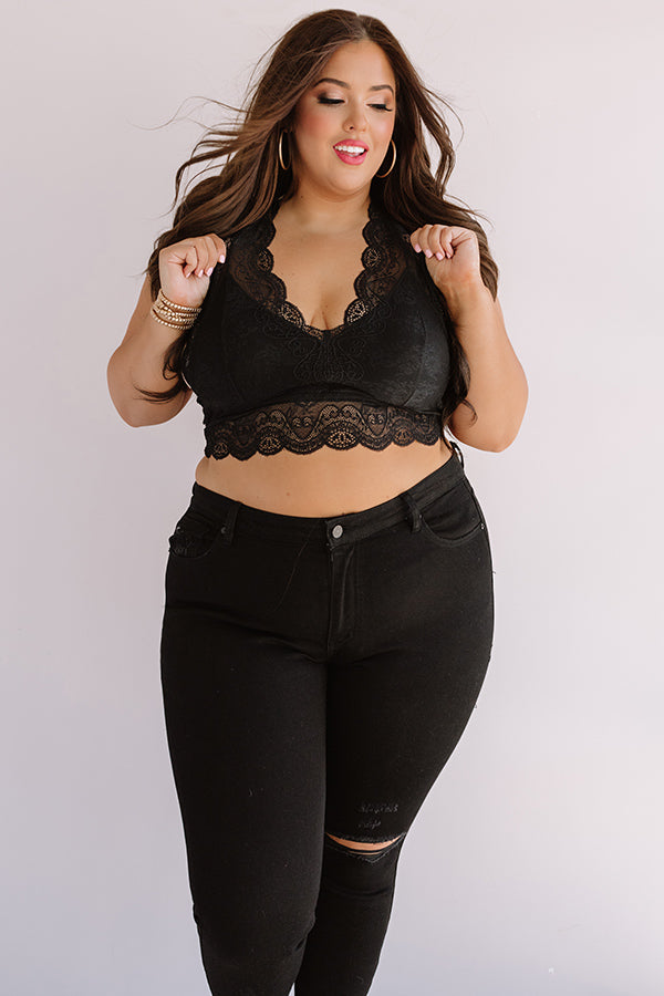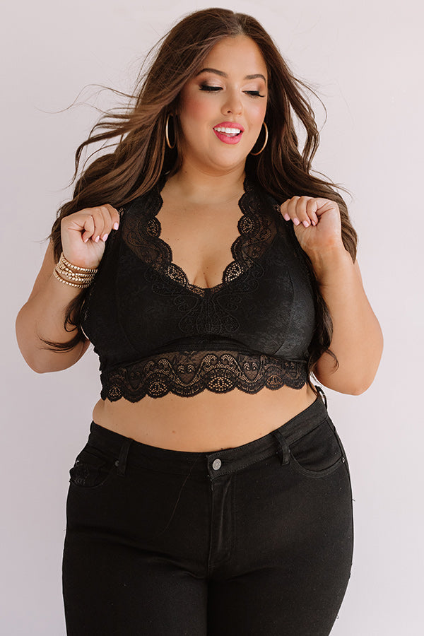 Plus Size - Add a femme and flirty touch to any look with our black "Aruba Kisses" bralette featuring a fabric lined triangle cut bust with a v-cut neckline, intricate lace detailing, wide 2-inch straps with a racerback silhouette, and a wide waistband with a scalloped hemline! Layer this beautiful piece under any of your favorite tees or slouchy sweaters to add an irresistible twist to any outfit!