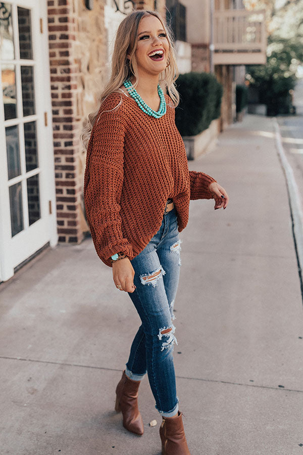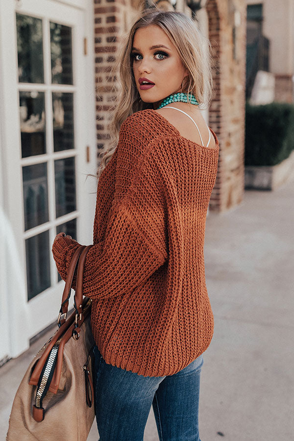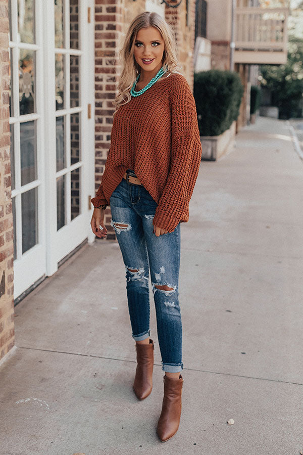 Stay warm and protected from the chilly "Aspen air" with this adorable rust hued sweater featuring soft lightweight tight knit material with ribbed texturing, a wide v-cut neckline that can be worn off one shoulder, long loose sleeves with fitted cuffs, and a relaxed silhouette that falls into rounded hemline! This cold weather essential can be styled a variety of ways, like with some distressed ankle skinnies, a turquoise statement necklace, a neutral tote, and a matching bootie, but you can also wear it with some charcoal flares and "The Seraphina Faux Leather Wedge in Grey!" Measurements