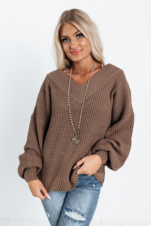 Chilly days have nothing on you in our dark taupe colored 'Aspen All Over Knit Sweater' which features a cozy knit material, a wide v-neckline that can easily be pulled off the shoulder, and relaxed balloon sleeves that gather at the cuff. We are lowkey crushing on the ribbed detail on the neck, hem, and cuffs of this snuggly sweater. Measurements