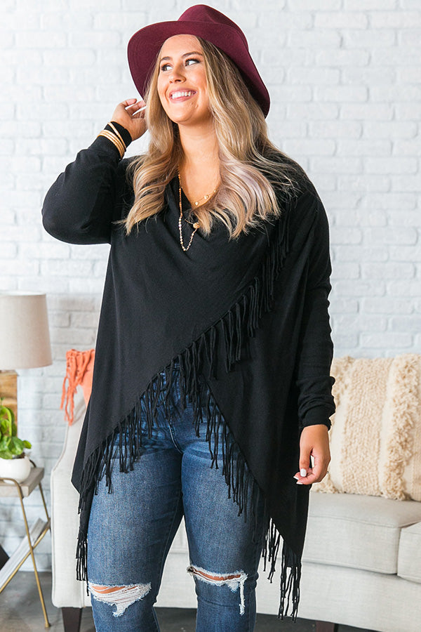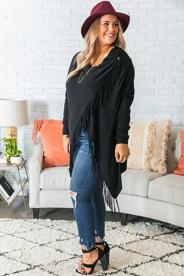 Plus Size - You and this knit crossover sweater are sure to be FRINGE forever! This fringe trimmed cardigan/sweater has long sleeves & a relaxed knit bodice that wraps & buttons on each side of the neckline; transforming this cardigan into a sweater. Whether you rock this fabulous fringed knit as a cardigan, or as a sweater, you will love the versatility this piece offers you.