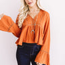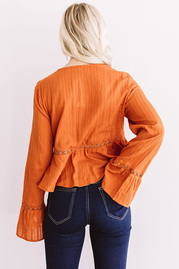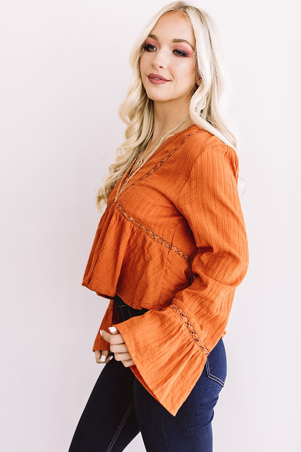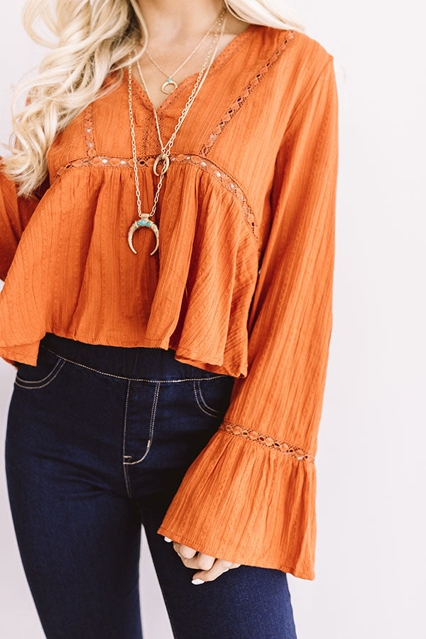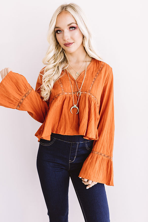 Put your best fashion foot forward when headed to an "Aspen happy hour" with this pumpkin colored top featuring lightweight subtly textured material, delicate crochet detailing, a v-cut neckline, long loose sleeves with flared cuffs, and a relaxed babydoll silhouette that falls into a cropped peplum bottom with an uneven hemline! We have styled this adorable fall piece with some dark wash flares, dainty jewelry, and a neutral platform heel and crossbody, but you can also wear it with some black ankle skinnies, "The Macon Faux Suede Bootie in Leopard," and our "Own The Spotlight Leopard Hat!" Measurements