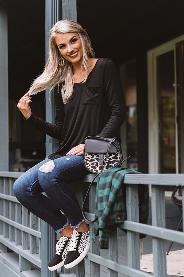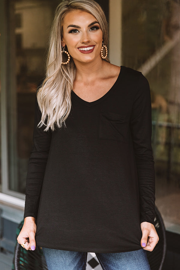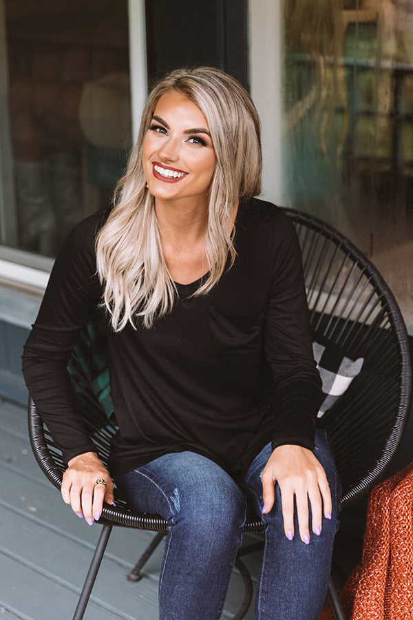 Looking for the best fall basic that's perfect for layering?! Then look no further that our casual but cute black "Aspen Hideaway Shift Top" featuring soft lightweight material, a v-cut neckline, long loose sleeves, a single accent chest pocket, and a relaxed silhouette that falls into a straight hemline! Measurements