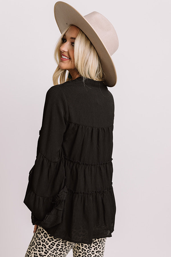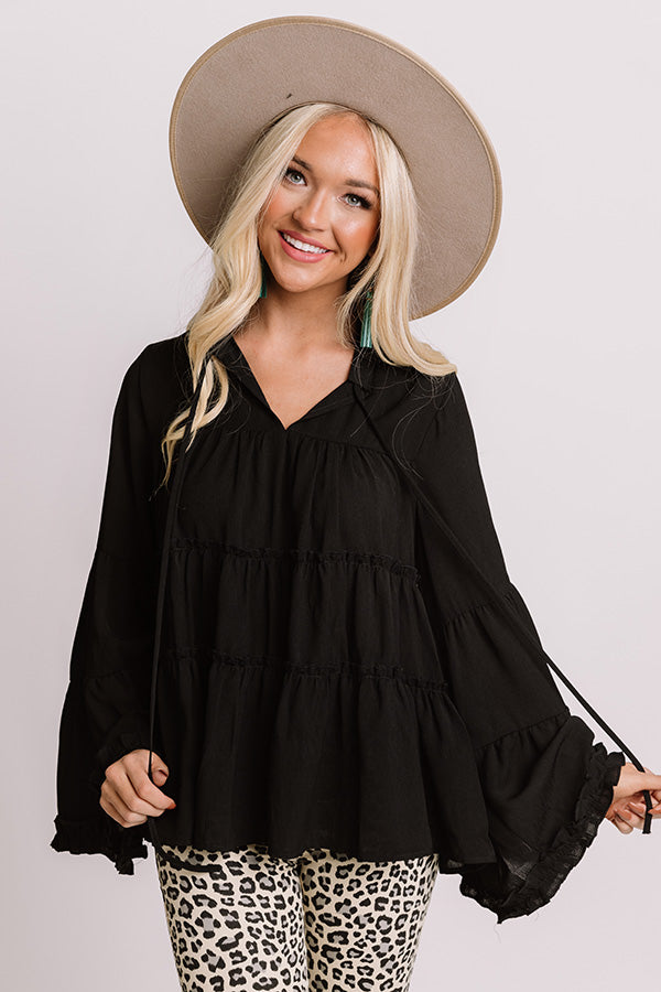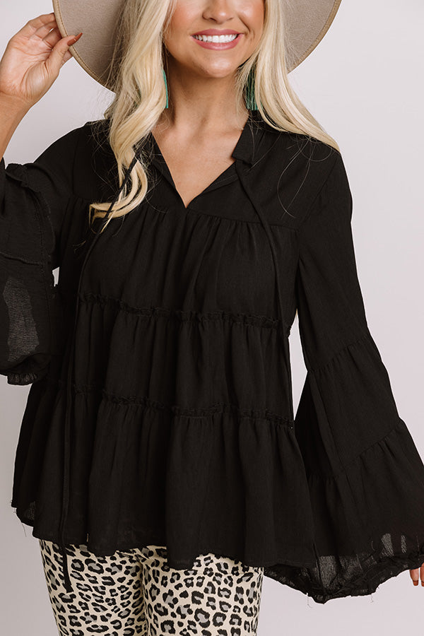 If you love fall most of all, then our charming black "Aspen Highlands" top is perfect for you with its lightweight flowy material, long loose sleeves with flared cuffs, ruffled seams and accent trim, v-cut neckline with a tie closure, and relaxed tiered babydoll silhouette that falls into an uneven hemline! Measurements