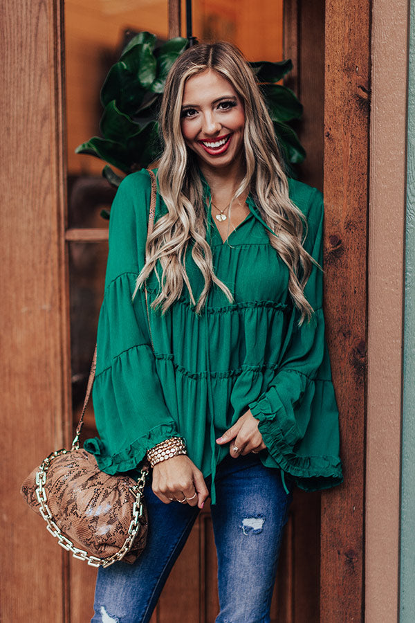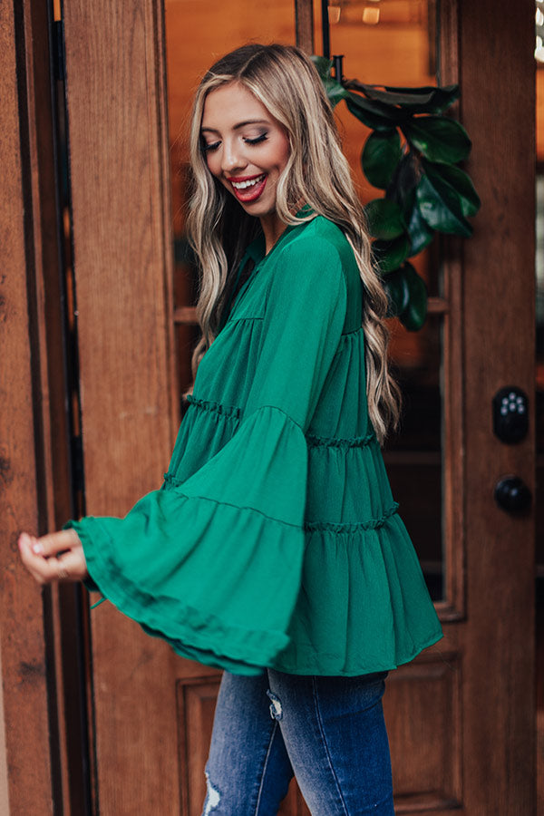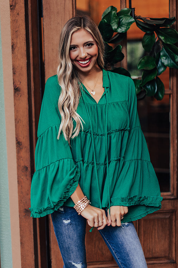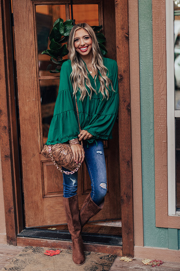 If you love fall most of all, then our charming green "Aspen Highlands" top is perfect for you with its lightweight flowy material, long loose sleeves with flared cuffs, ruffled seams and accent trim, v-cut neckline with a tie closure, and relaxed tiered babydoll silhouette that falls into an uneven hemline! Measurements