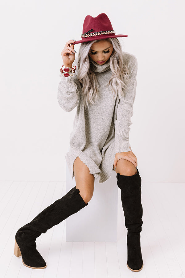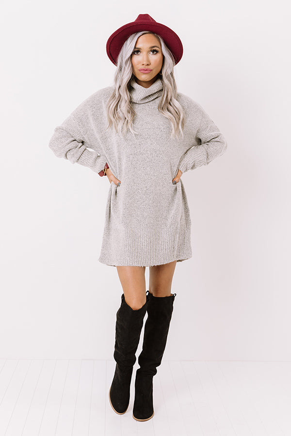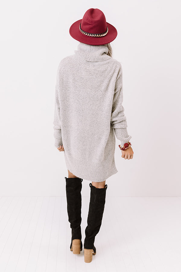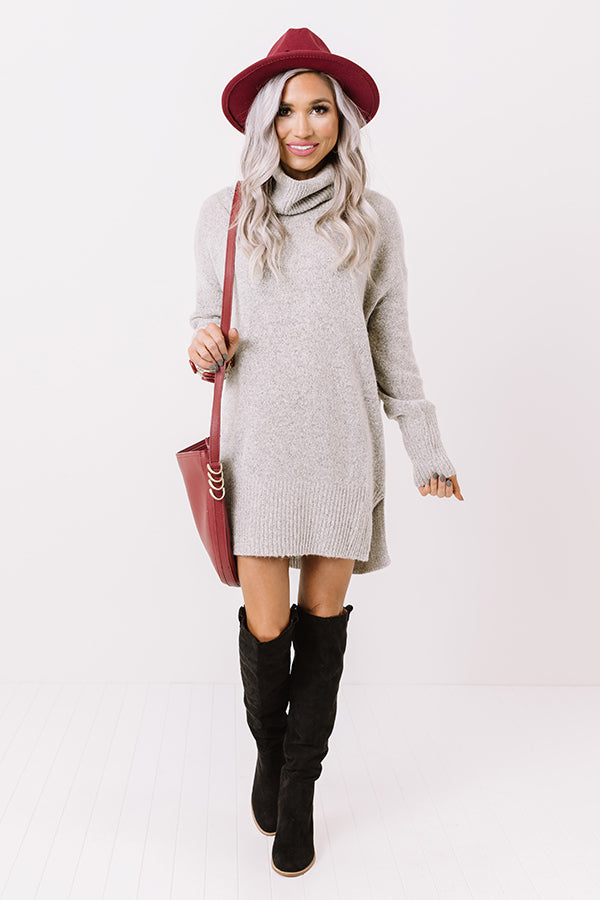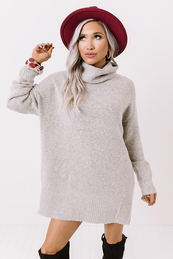 Chic warmth awaits with the 'Aspen Road Trip Sweater' in grey. This oversized sweater is tunic length with a split hem and features full sleeves and a seriously soft knit material. We can't quit crushing on the turtlneck and the. ribbed detailing on the hem, neck, and cuffs. Measurements