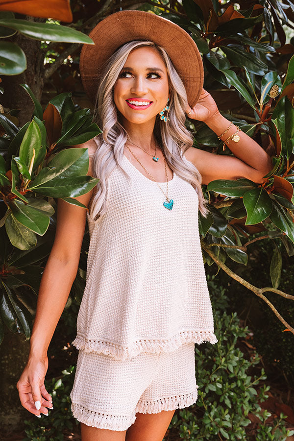 Ease into style effortlessly with this adorable top featuring soft lightweight material with waffle knit texturing, a scooped neckline, wide 2-inch sleeveless shoulder straps, and a relaxed silhouette that falls into a straight hemline with fringed trim detailing! This comfy piece styles perfectly with our matching "At East Waffle Knit Shorts," turquoise statement jewelry, a woven leopard clutch, and a brown block heel and faux suede hat for the ultimate two-piece summer look! Measurements