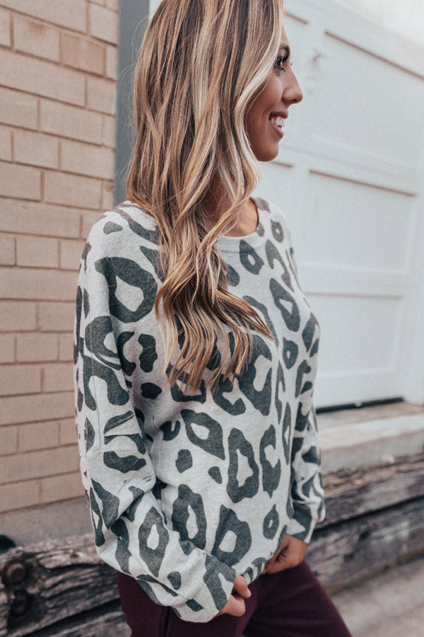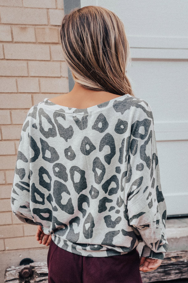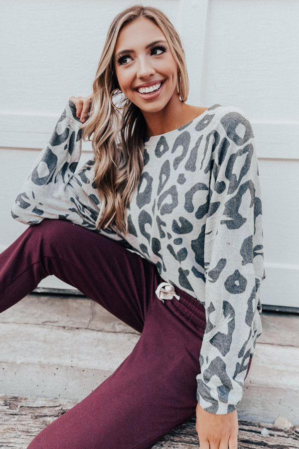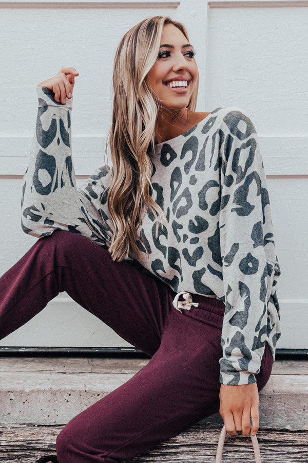 There is no better way to look your best while headed to the gym than with this adorable sweatshirt featuring soft lightweight material patterned with a bold dark grey leopard print, a wide rounded neckline, long loose sleeves, and a relaxed silhouette that falls into a straight hemline! You can dress this adorable piece down with some wine colored joggers and matching wedged sneakers, but you can also style it up with some distressed light wash ankle skinnies, our "All Caught Up Headband in Blush," a matching tote, and "The Saylie Peep Toe Heel in Blush!" Measurements