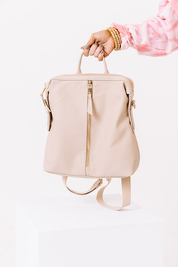 There is no better bag to carry on an adventure than this adorable iced latte colored backpack featuring sleek lightweight faux leather material, a vertical accent zipper down the front, a single handle, two adjustable shoulder straps, and a spacious fully lined pouch with a zip closure and additional inside pockets!