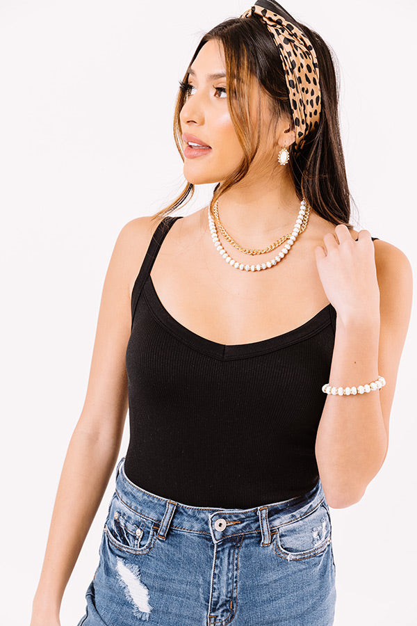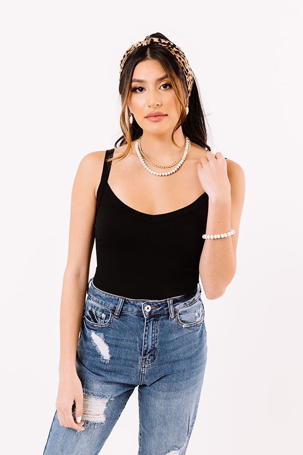 Stay casual and cute all year round with our basic black 'Authentic Love' bodysuit featuring lightweight stretchy material with ribbed texturing, a scooped neckline, 1-inch sleeveless shoulder straps with a low square back, and a form fitting silhouette that falls into cheeky fit bottoms with a snap button closure! Measurements