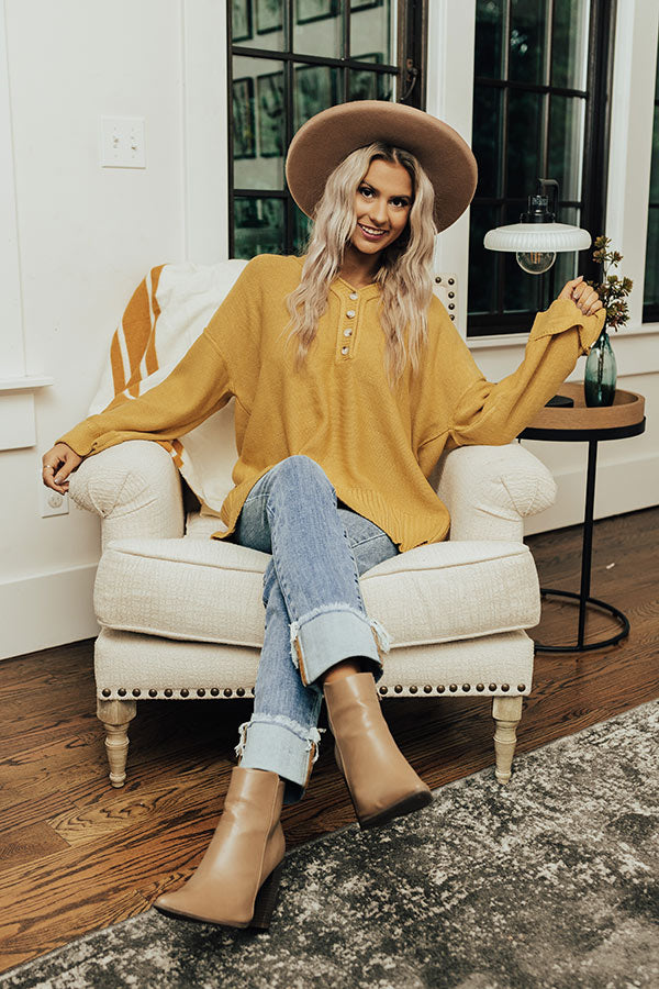 Keep it simple but stylish in our charming light mustard colored 'Autumn Affair' sweater featuring soft and lightweight knit material, a button up bodice with a v-cut neckline, long loose sleeves with roll tab cuffs, exposed accent seams, and a slouched silhouette that falls into a straight hemline with ribbed trim detailing!